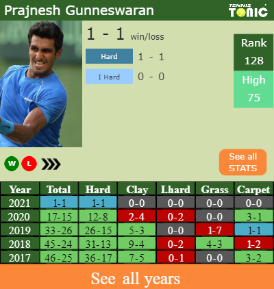 Prajnesh has a 1-1 win-loss record in 2021, 0-0 on indoor hard courts (See FULL STATS).