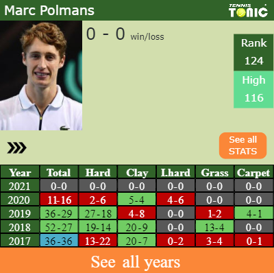 This will be the 2nd time that Marc Polmans and Bernard Tomic square off. The head to head is 1-0 for Tomic (see full H2H stats), 1-0 on hard.
