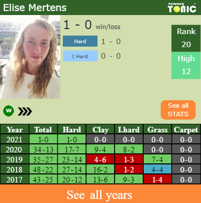 Mertens has a solid record in the last 9 years having won 66% of her matches (340-177). 1-0 on hard in 2021. In connection with her performance on the same surface of this competition, Mertens has a 190-85 match record in the last 9 years on hard.