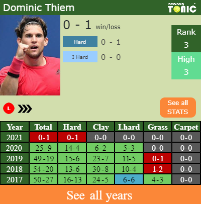 Thiem has a 0-1 win-loss record in 2021, 0-1 on hard (See FULL STATS).