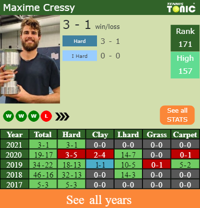 Cressy has a 3-1 win-loss record in 2021, 3-1 on hard (See FULL STATS).