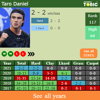 This will be the 2nd time that Taro Daniel and Maxime Cressy play each other. The head to head is 1-0 for Daniel (see full H2H stats), 1-0 on hard.