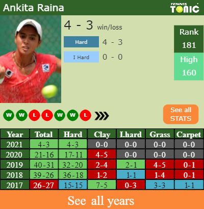 In terms of her career, Ankita has an overall 260-202 record. She has a positive 203-137 record on hard.