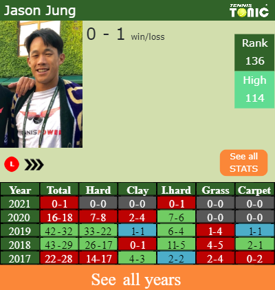 Jason has a 0-1 win-loss record in 2021, 0-0 on hard (See FULL STATS).