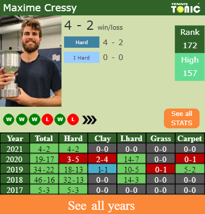 Maxime has a 4-2 win-loss record in 2021, 4-2 on hard (See FULL STATS).