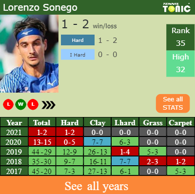 Talking about his overall career, Sonego has an overall 246-165 record. He has a positive 30-21 record on indoor hard courts.