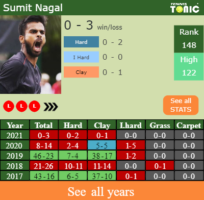 The Indian has a 0-3 win-loss record in 2021, 0-1 on clay (See FULL STATS).