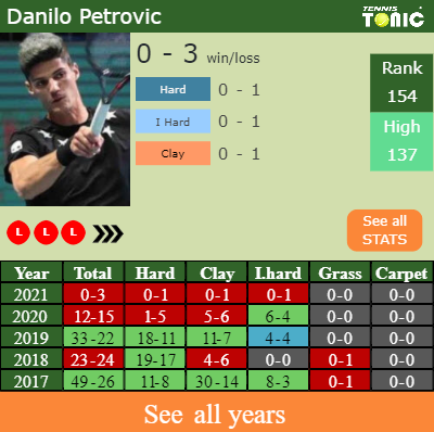 This will be the 2nd time that Danilo Petrovic and Riccardo Bonadio square off. The head to head is 1-0 for Petrovic (see full H2H stats), 1-0 on clay.