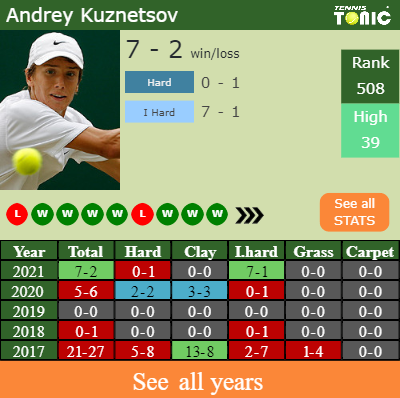 Kuznetsov has a 7-2 win-loss record in 2021, 7-1 on indoor hard courts (See FULL STATS).