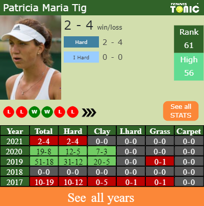 Maria Tig has a 2-4 win-loss record in 2021, 2-4 on hard (See FULL STATS).