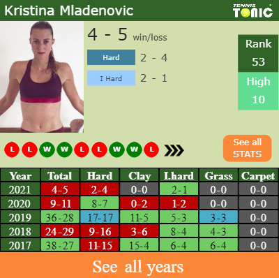 Kristina has a 4-5 win-loss record in 2021, 2-4 on hard (See FULL STATS).