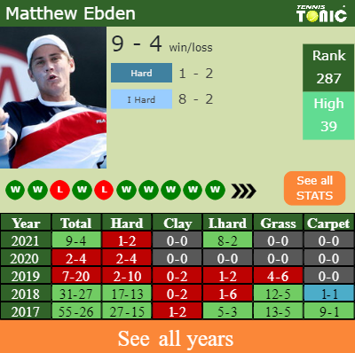 Matthew has a 9-4 win-loss record in 2021, 8-2 on indoor hard courts (See FULL STATS).