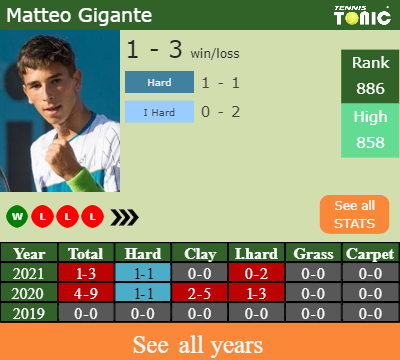 In terms of his career, Gigante has an overall 5-12 record. He has a negative 1-5 record on indoor hard courts.