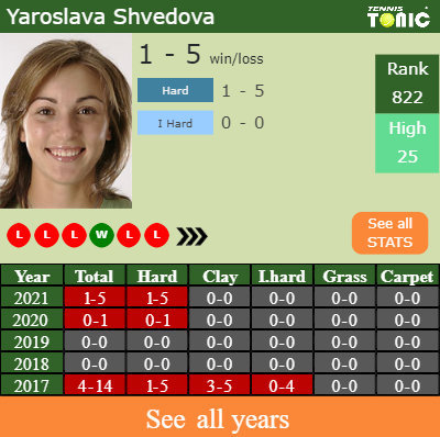 Shvedova has a 1-5 win-loss record in 2021, 1-5 on hard (See FULL STATS).