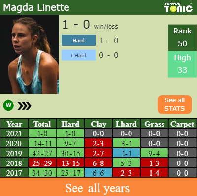 Linette has a 1-0 win-loss record in 2021, 1-0 on hard (See FULL STATS).