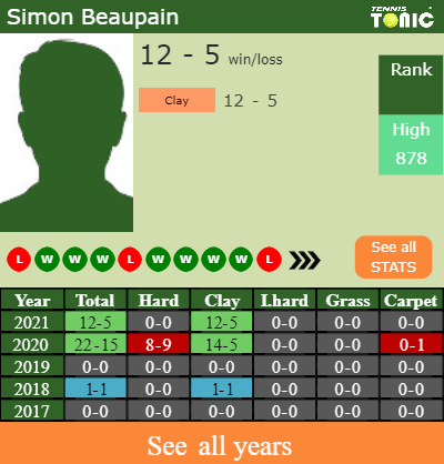 Beaupain has a 12-5 win-loss record in 2021, 12-5 on clay (See FULL STATS).