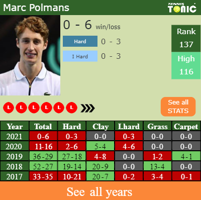 The Australian has a 0-6 win-loss record in 2021, 0-0 on clay (See FULL STATS).