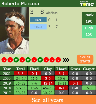 Marcora has a 3-8 win-loss record in 2021, 0-0 on clay (See FULL STATS).