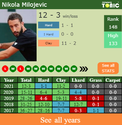 Milojevic has a 12-3 win-loss record in 2021, 11-2 on clay (See FULL STATS).