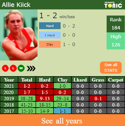 This will be the 3rd time that Kurumi Nara and Allie Kiick play each other. The head to head is 2-0 for Nara (see full H2H stats), but they have never played each other on clay.