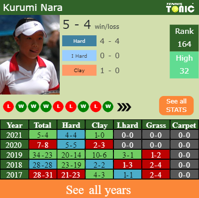 Nara has a good record in the last 10 years having won 53% of her matches (251-222). 1-0 on clay in 2021. In connection with her performance on the same surface of this event, Nara has a 39-41 win-loss record in the last years on clay.