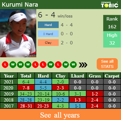Nara has a 6-4 win-loss record in 2021, 2-0 on clay (See FULL STATS).