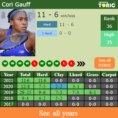 Talking about her overall career, Cori has an overall 61-33 record. She has a positive 14-9 record on clay.