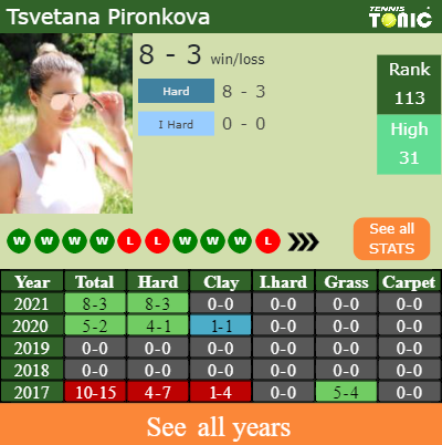 Pironkova has a 8-3 win-loss record in 2021, 0-0 on clay (See FULL STATS).
