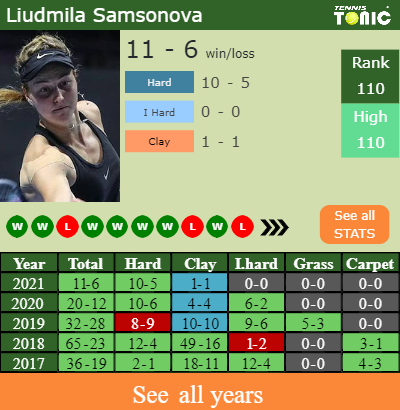Ludmilla has a 11-6 win-loss record in 2021, 1-1 on clay (See FULL STATS).