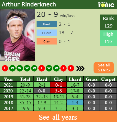 In terms of his career, Arthur has an overall 156-77 record. He has a positive 45-26 record on clay.