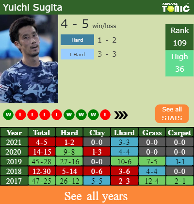 Sugita has a 4-5 win-loss record in 2021, 0-0 on clay (See FULL STATS).