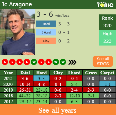 Aragone has a winning win-loss record in the last 7 years having won 54% of his matches (136-118). 3-3 on hard in 2021. Regarding his performance on the same surface of this tournament, Aragone has a 86-66 record in the last 7 years on hard.