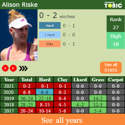 Alison has a 0-2 win-loss record in 2021, 0-1 on clay (See FULL STATS).