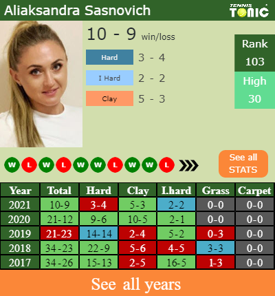 Aliaksandra has a compiled 10-9 win-loss record in 2021, 5-3 on clay (See FULL STATS).