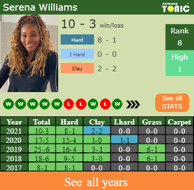 Williams has a marvellous match record in the last 10 years having won 89% of her matches (357-46). 2-2 on clay in 2021. Regarding her performance on the same surface of this event, Williams has an overall 90-8 match record in the last years on clay.