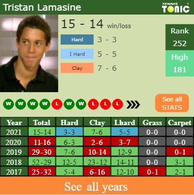 Tristan has an overall 15-14 win-loss record in 2021, 7-6 on clay (See FULL STATS).