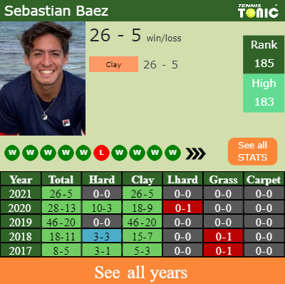 The Argentine has a compiled 26-5 win-loss record in 2021, 26-5 on clay (See FULL STATS).