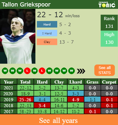 Tallon has an aggregate 22-12 win-loss record in 2021, 13-7 on clay (See FULL STATS).