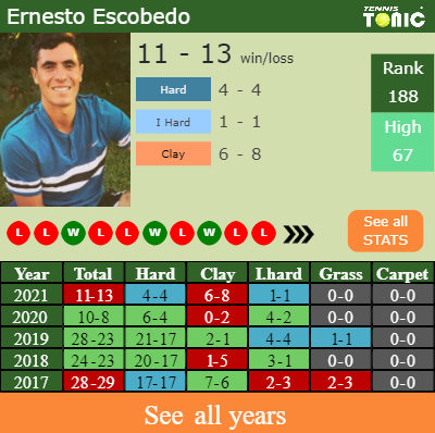 Ernesto has a composed 11-13 win-loss record in 2021, 0-0 on grass (See FULL STATS).