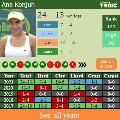 Konjuh has an overall 24-13 win-loss record in 2021, 1-1 on grass (See FULL STATS).