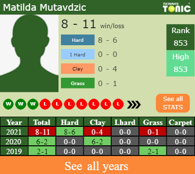 Mutavdzic has a composed 8-11 win-loss record in 2021, 0-1 on grass (See FULL STATS).