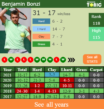 Bonzi has a solid match record in the last 6 years having won 62% of his matches (229-138). 4-1 on grass in 2021. Regarding his performance on the same surface of this event, Bonzi has a compiled7-2 match record in the last 6 years on grass.