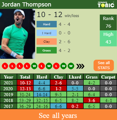 Thompson has a composed 10-12 win-loss record in 2021, 4-2 on grass (See FULL STATS).