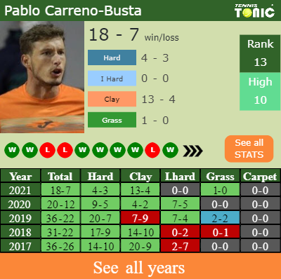 Carreno-Busta has a composed 18-7 win-loss record in 2021, 1-0 on grass (See FULL STATS).