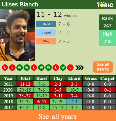 Blanch has a composed 11-12 win-loss record in 2021, 7-6 on hard (See FULL STATS).