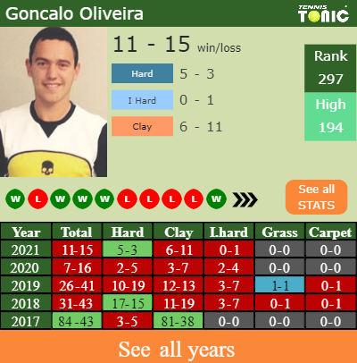 Oliveira has a composed 11-15 win-loss record in 2021, 5-3 on hard (See FULL STATS).