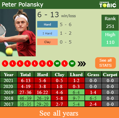 Polansky has an overall 6-13 win-loss record in 2021, 5-6 on hard (See FULL STATS).