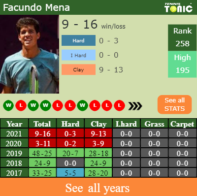 The Argentine has a composed 9-16 win-loss record in 2021, 9-13 on clay (See FULL STATS).