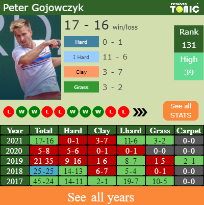 Peter has a composed 17-16 win-loss record in 2021, 3-2 on grass (See FULL STATS).