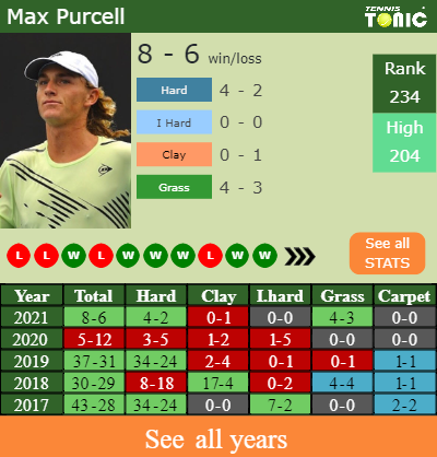 Purcell has a winning win-loss record in the last 7 years having won 57% of his matches (164-124). 4-2 on hard in 2021. Talking about his performance on the same surface of this event, Purcell has an overall123-90 record in the last 7 years on hard.